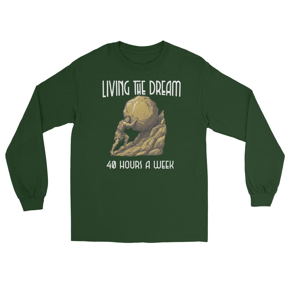 Embrace the eternal grind with this sarcastic Sisyphus design! Reimagining Greek mythology as the ultimate office humor, this graphic pairs the legendary boulder struggle with the relatable lie: ‘Living the Dream, 40 Hours a Week.’ A perfect funny gift for coworkers battling corporate burnout or the modern grind. Whether youâre into existential philosophy or just surviving Mondays, this snarky anti-work art captures the absurd reality of the cubicle!