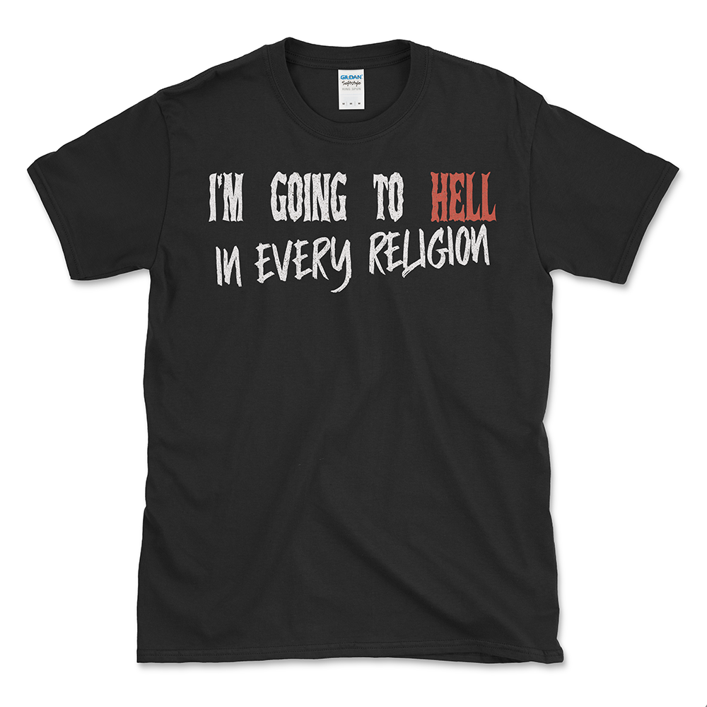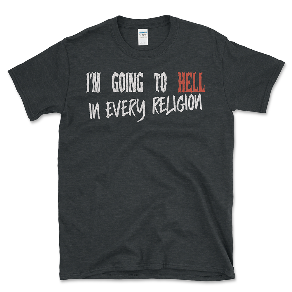 Embrace Universal Irreverence: The Ultimate Statement Tee! You’ve heard it before, no matter where you turn—different religions, different views, and a one-way ticket to the ‘down-below’ if you don’t conform. With our bold new tee, step out with a wink and a smile, announcing that, according to the myriad of religious views, “I’m going to hell in every religion.” It’s not just a shirt; it’s a conversation starter, a statement of intellectual independence, and a testament to the rich tapestry of belief systems that often intersect in ironic and humorous ways.
