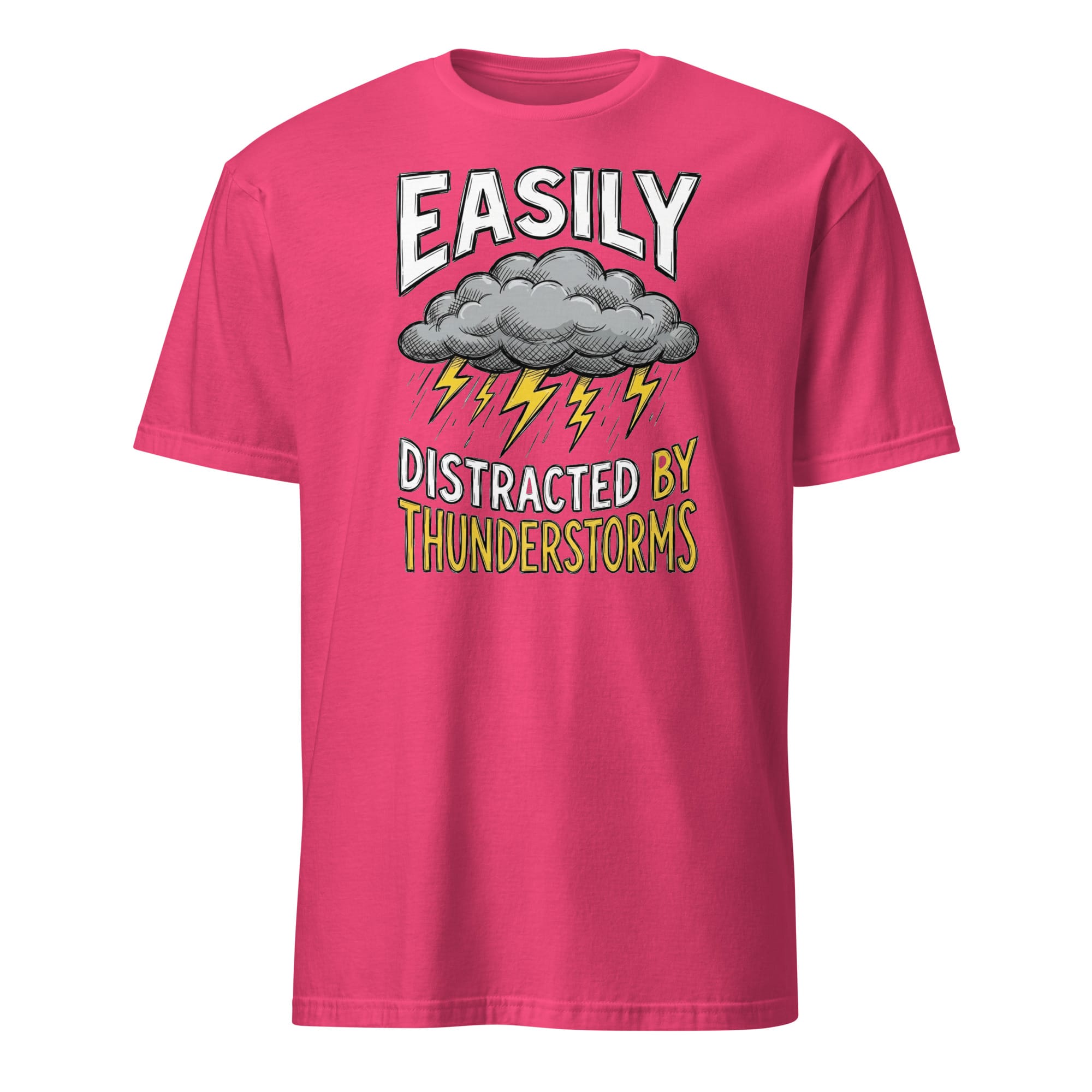Whether youâre a storm chaser or a proud pluviophile, this “Easily Distracted by Thunderstorms” design is your perfect match! Featuring a bold, sketchy dark cloud and vibrant lightning bolts, itâs a funny gift for any weather enthusiast who can’t help but look up when the sky turns gray. Ideal for meteorologists, nature lovers, or anyone who finds peace in a downpour. Embrace the thunder and show off your passion for petrichor and the smell of rain!