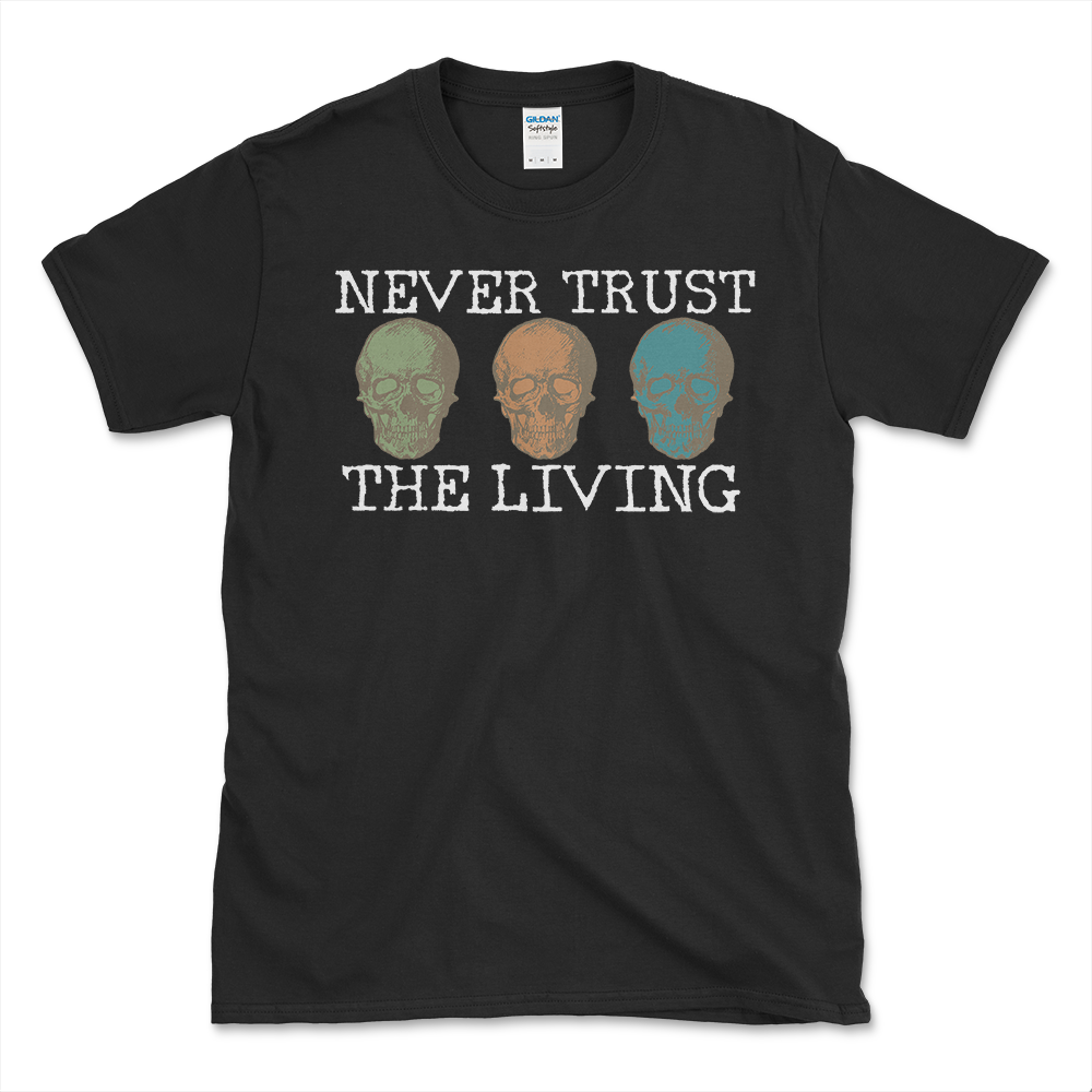 Step into the world of Vintage Horror and Gothic Fashion with Left Arrow Tees’ haunting “Never Trust The Living” skull t-shirt, a design that captures the sardonic spirit of Tim Burton’s masterpieces and the dark humor of beloved Movie Quotes. This eye-catching Horror Movie Merch features a meticulously detailed skull design that would make any Beetlejuice fan proud, perfectly embodying the Dark Aesthetic that genre enthusiasts crave. Made for those who celebrate Spooky Season all year round, this shirt combines classic horror elements with a touch of contemporary edge, creating the perfect addition to your alternative wardrobe.