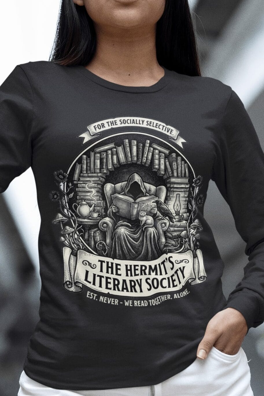 Join The Hermit’s Literary Society with this stunning dark academia design! Perfect for the socially selective bookworm, this vintage gothic illustration features a hooded figure reading amidst stacks of books, a cozy tea set, and mystical companions like a raven and black cat. Embrace your inner introvert with the motto: “We Read Together, Alone.” A must-have for bibliophiles, library-core fans, and anyone who prefers a quiet enchanted forest of pages to crowds. Truly magical!